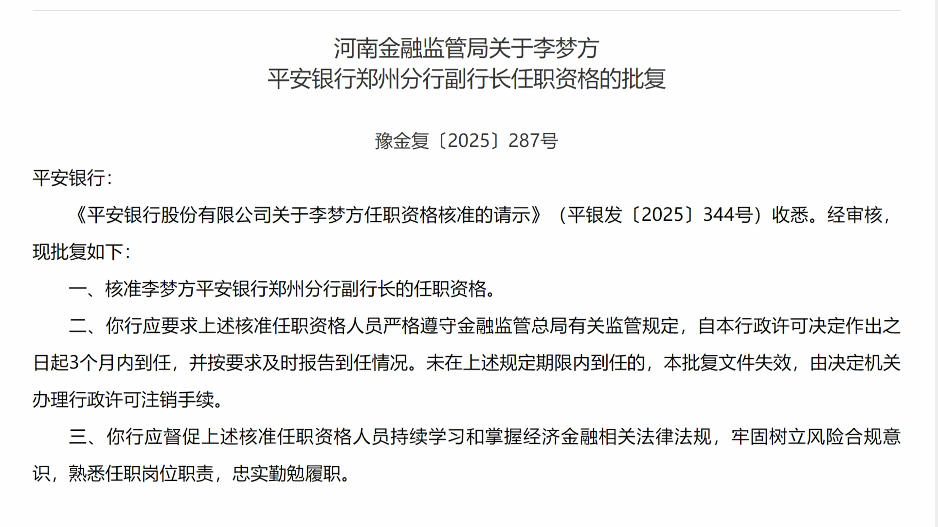 11月20日,河南金融监管局发布关于李梦方平安银行郑州分行副行长任职资格的批复,核准李梦方平安银行郑州分行副行长的任职资格。